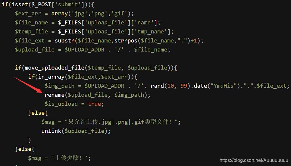 发现move_uploaded_file()函数中的img_path是由post参数save_name控制的,因此可以在save_name利用00截断绕过: